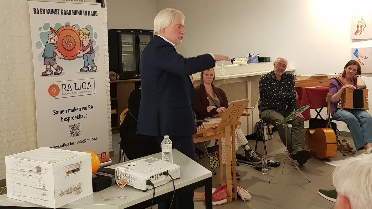 Ik was erg vereerd dat ik er op de opening van de tentoonstelling in Tessenderlo bij mocht zijn. Ik weet immers hoeveel energie het vraagt om een dergelijk initiatief met een reizende expo met oorspronkelijke kunstwerken te organiseren. Ik doe daar dan ook mijn hoedje voor af. Het was ontroerend om te zien dat ik de authenticiteit waar ik zo van houd ook terugzag bij Jeannine van de RA Liga en bij Nelly die tijdens haar inbreng als ervaringsdeskundige een antwoord gaf op de vraag of het hebben van RA leefbaar is. Haar antwoord was ‘ja’.